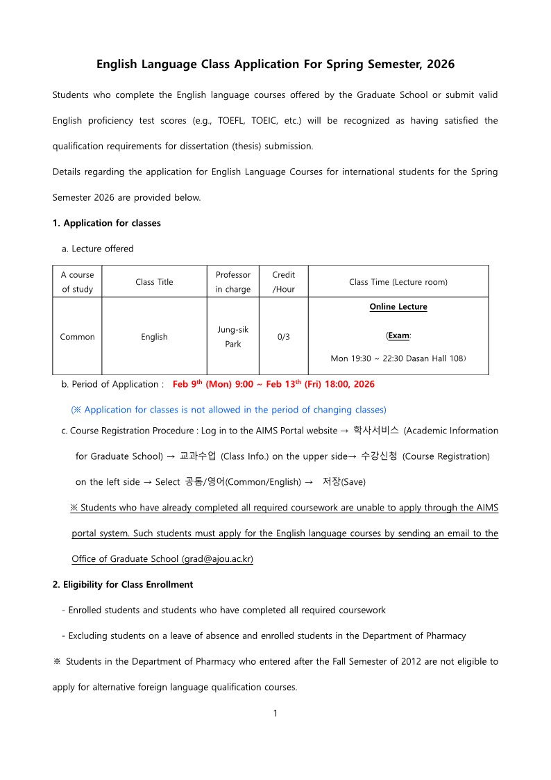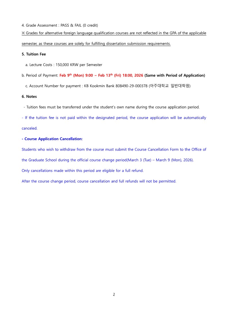 Application for Korean Language Classes for Foreign Students, Spring 2026