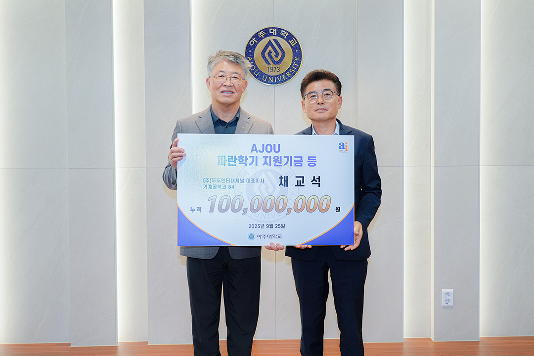 지난 25일 율곡관 총장실에서 열린 기부금 전달식 행사에는 한만엽 건설시스템공학과 명예교수, 채교석 ㈜두두인터내셔널 대표, 이종숙 수성교통 회장, 조태훈 ㈜씨엠엔바이온 대표가 참석했다. 학교에서는 최기주 총장과 장우진 교무혁신처장, 조경숙 대학발전본부장이 자리했다. 최기주 총장이 아주 가족을 대표해 감사 인사를 전하고 감사패와 예우품을 전달했다.