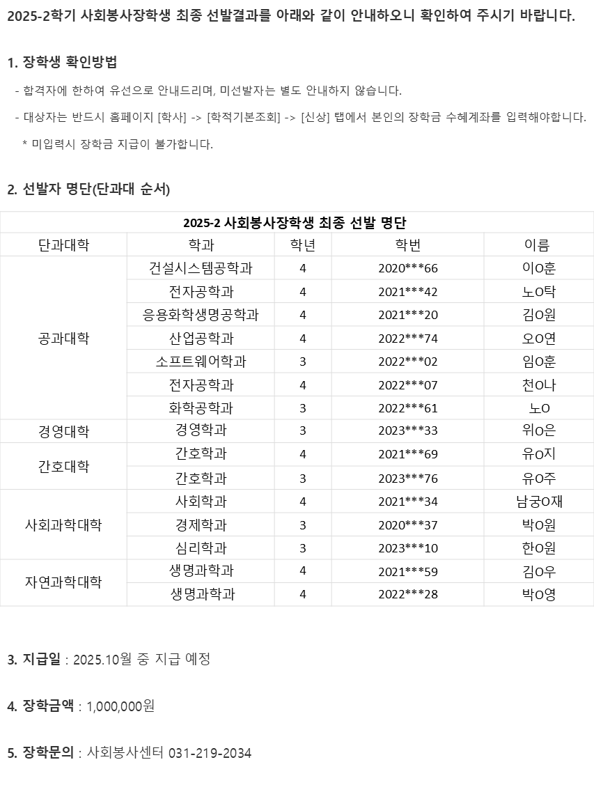 [장학] [교내장학] 2025학년도 2학기 사회봉사장학생 최종 선발 결과 안내