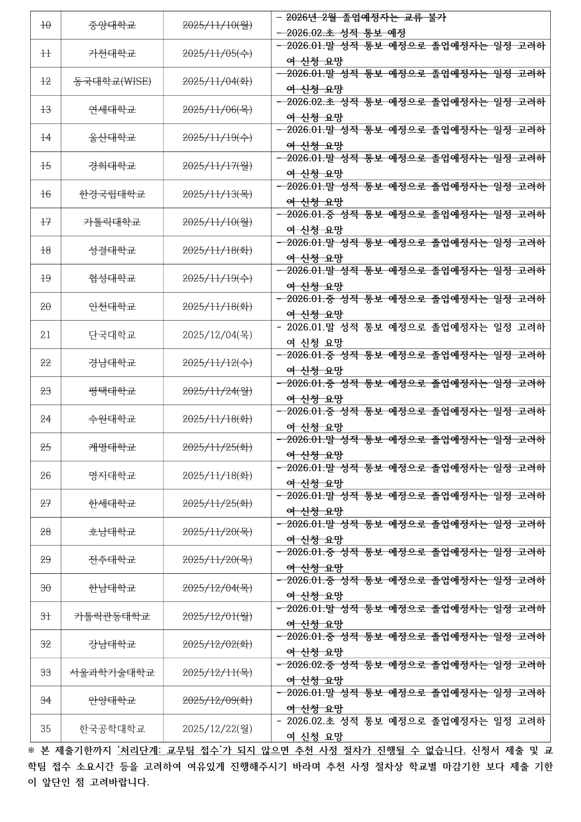 제출기한 내 '처리상태:교무팀접수'가 되지 않을 시 자동 추천사정에 탈락되는 점 참고 바랍니다.