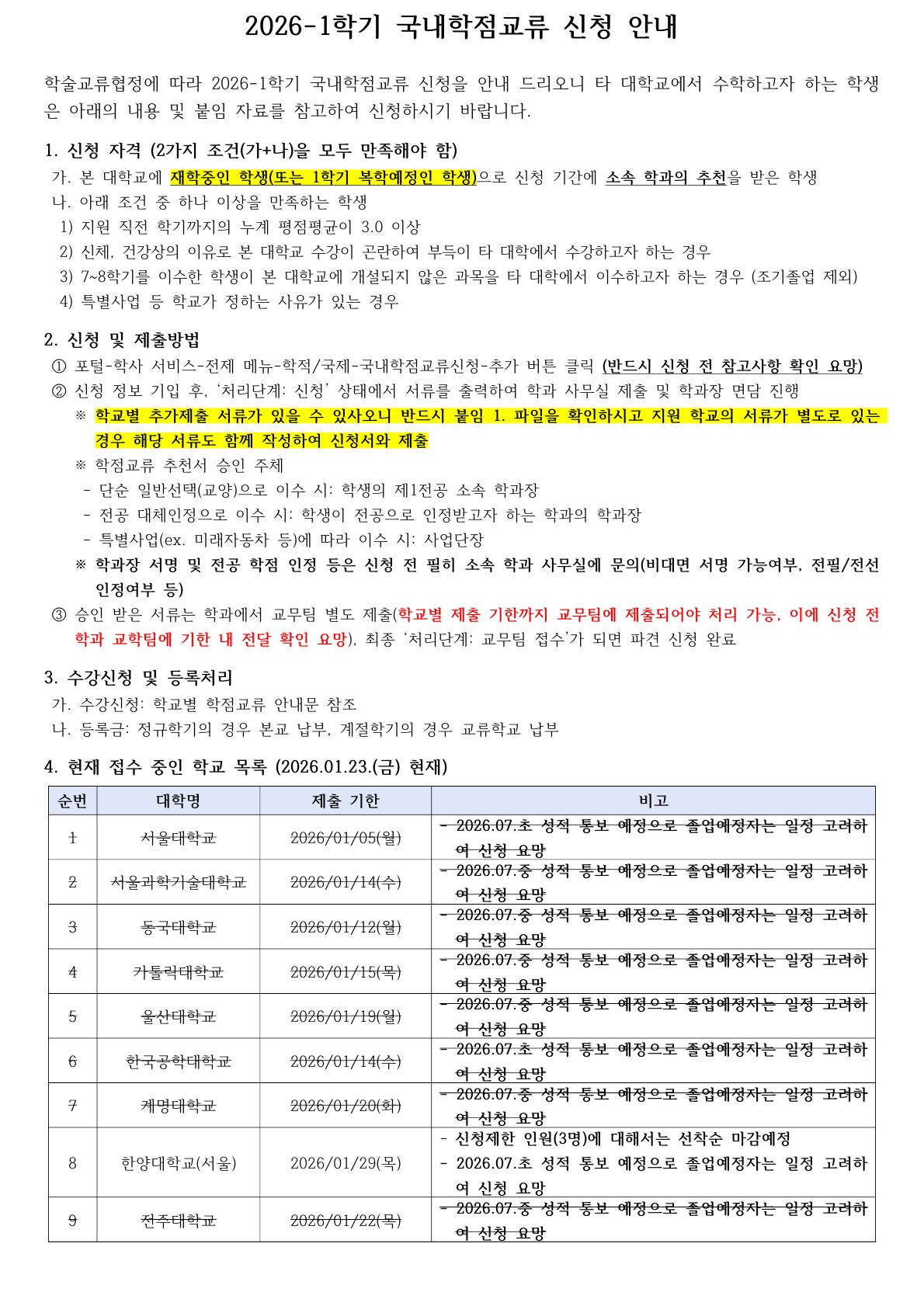 [학사] [학부/학사과정] (26.01.23.) 2026-1학기 국내대학 학점교류 신청 안내
