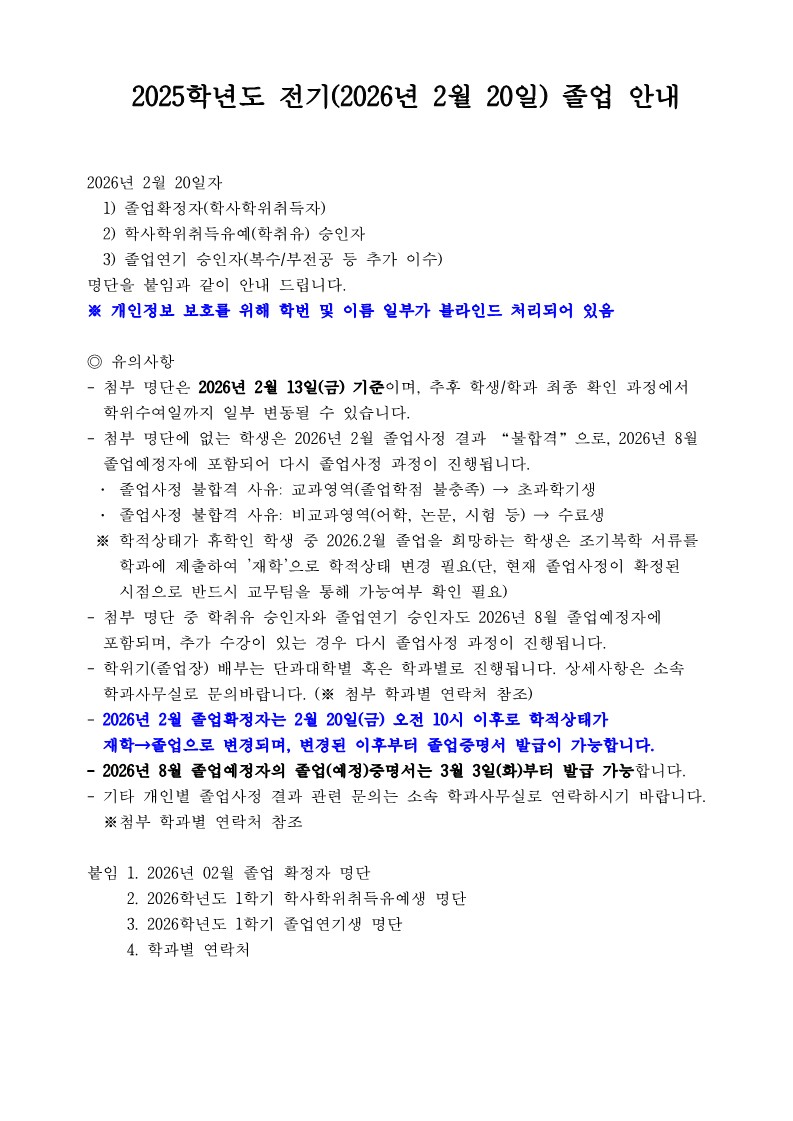 [학사] [학부]2025학년도 전기(2026년 2월 20일)졸업확정자(학사학위취득자), 학사학위취득유예자, 졸업연기 승인자 안내