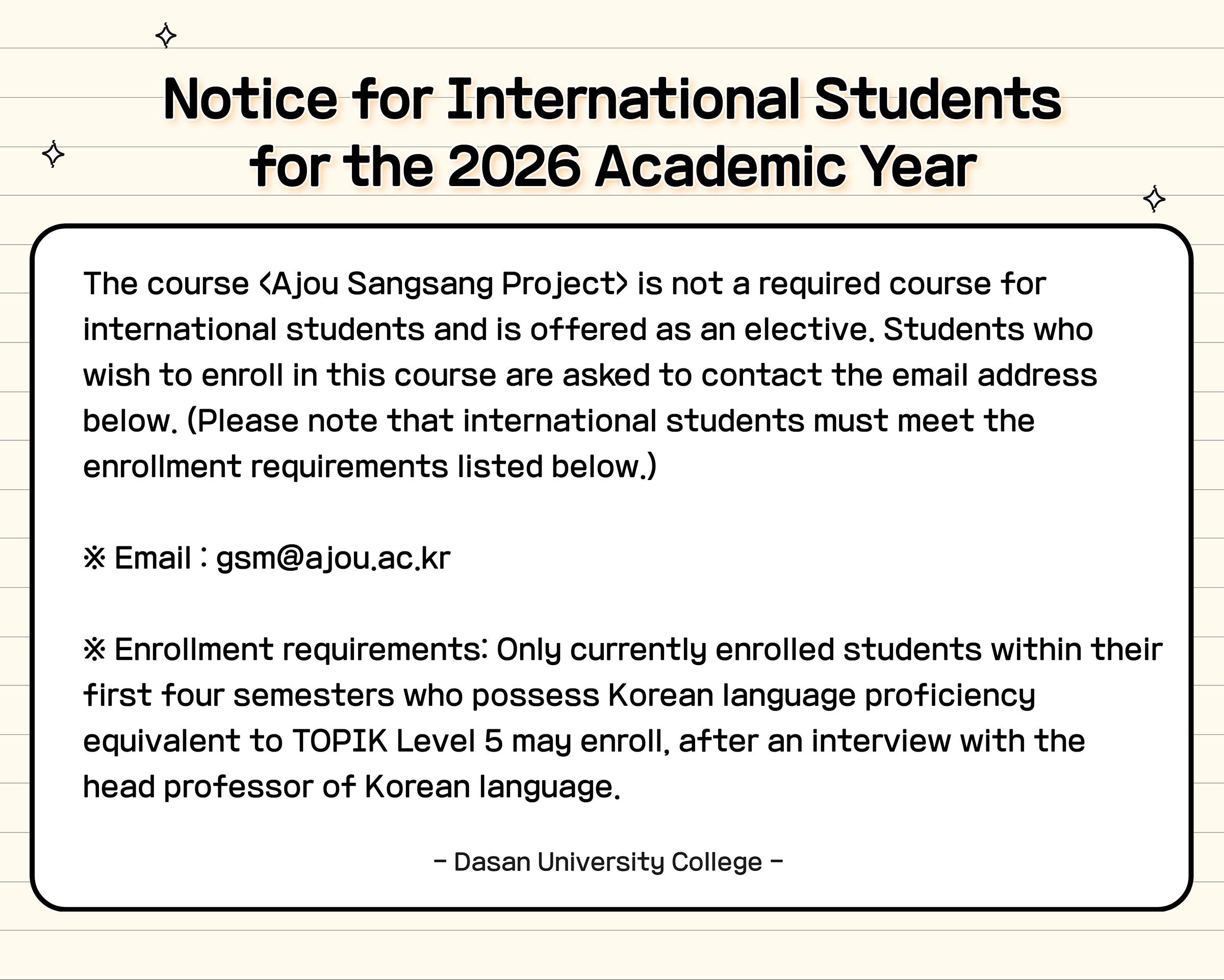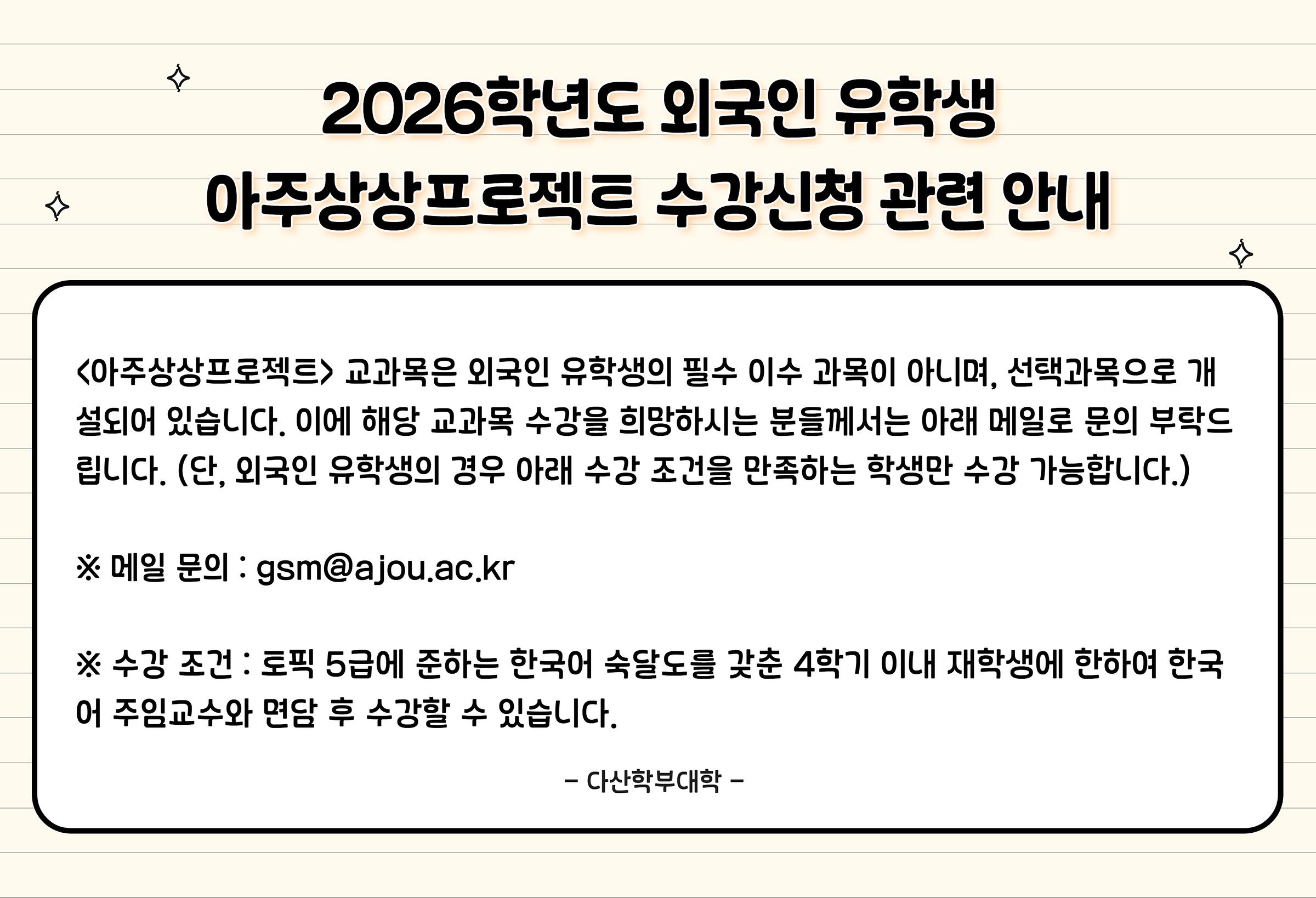 [학사] 2026학년도 '아주상상프로젝트' 유학생 수강 신청 관련 안내