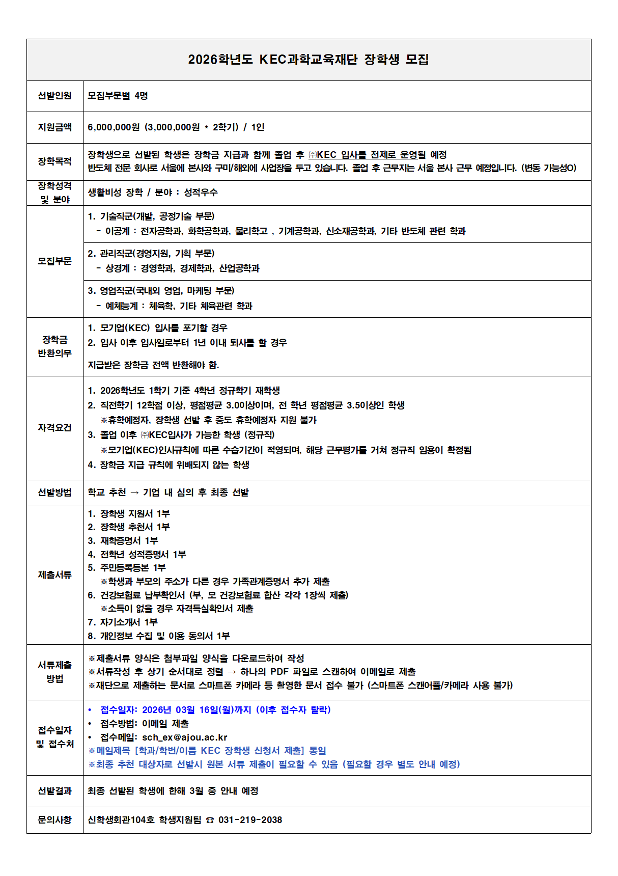 [장학] [교외장학] 2026년도 KEC과학교육재단 산학장학생 후보자 모집 공고(~03.16.(월)까지)