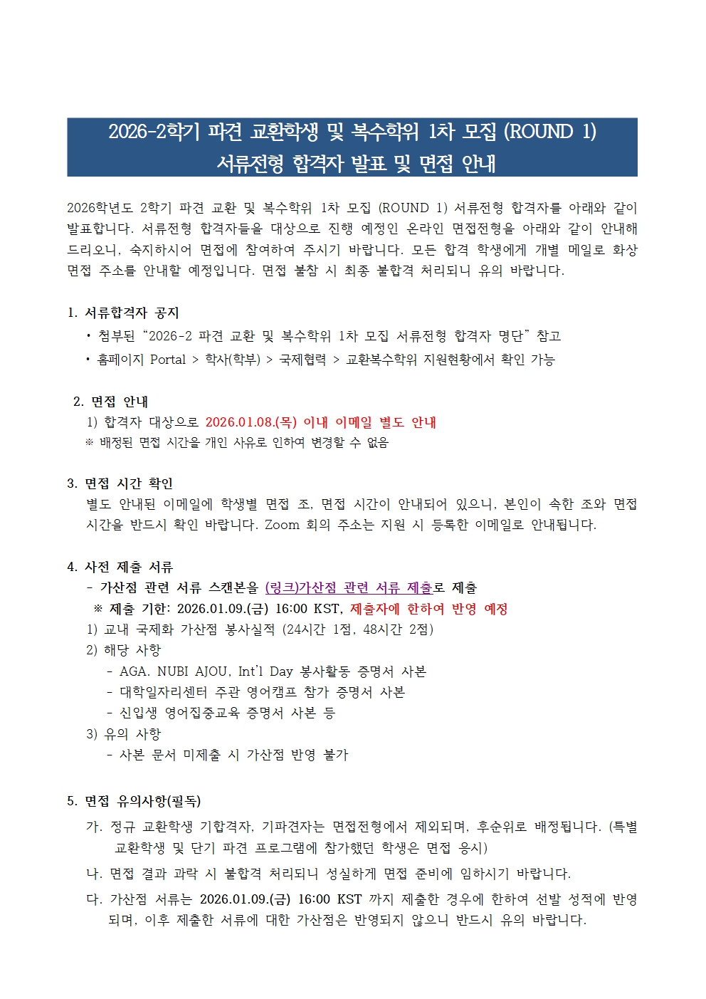 [공지] 2026-2학기 파견 교환 및 복수학위 1차 모집 서류 합격자 공지