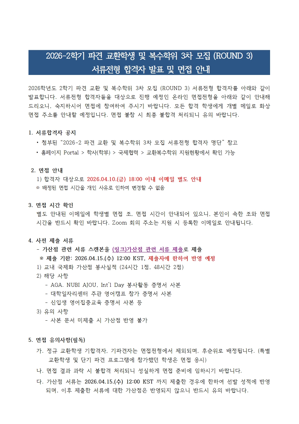 면접대상자 명단에 포함되었으나 2026.04.10.(금) 18:00이내 면접 안내 이메일을 수신하지 못한 경우 국제교류팀으로 연락 바랍니다.