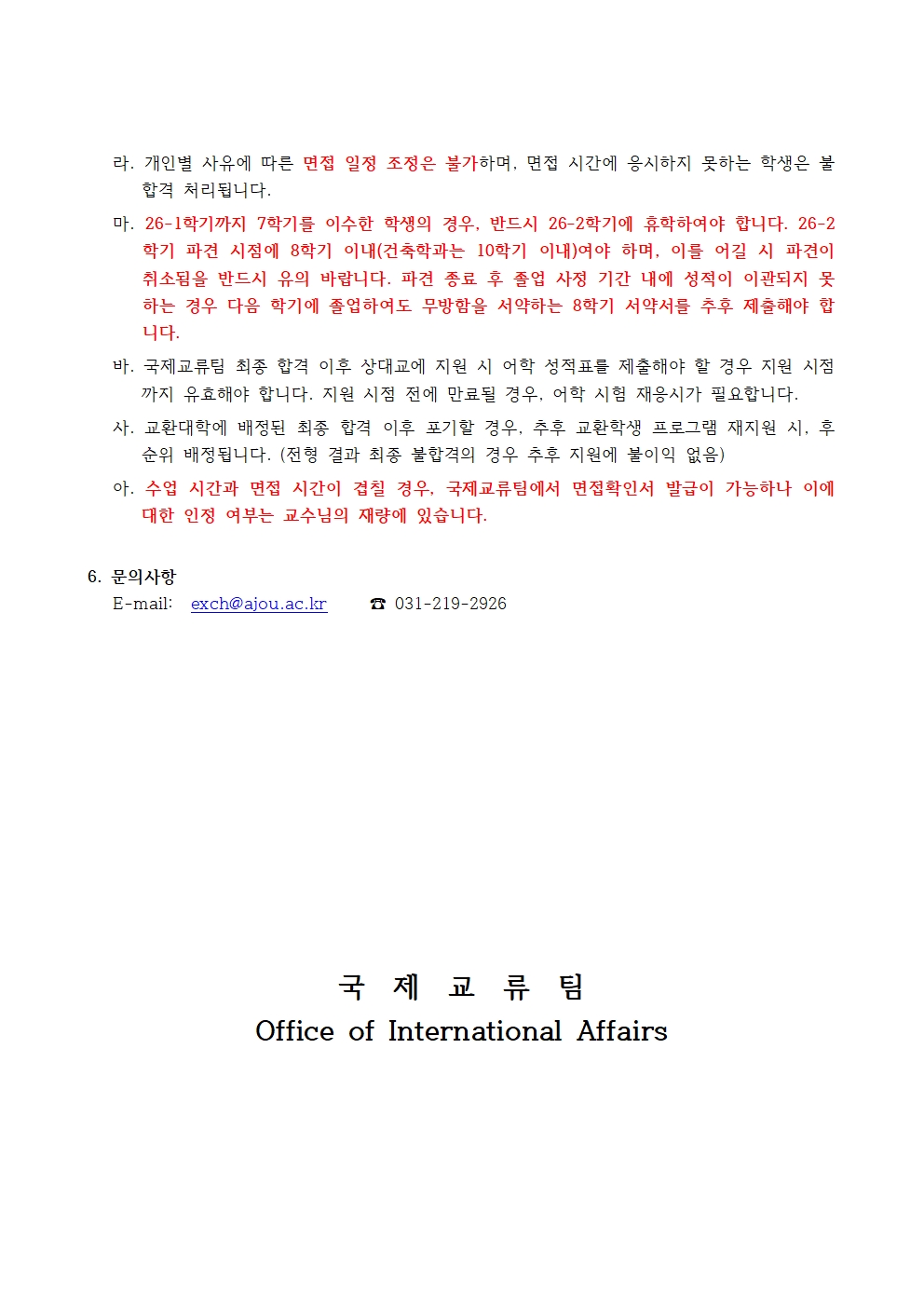 3) 면접확인서 발급이 필요한 학생의 경우, "면접전형 종료 이후" 일주일 이내로 exch@ajou.ac.kr로 성명/학과/학번/배정된 면접시간과 함께 요청 이메일을 보내주세요.