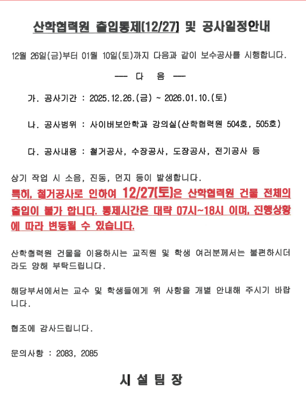 [공지] 산학협력원 출입통제[12/27] 및 공사일정안내