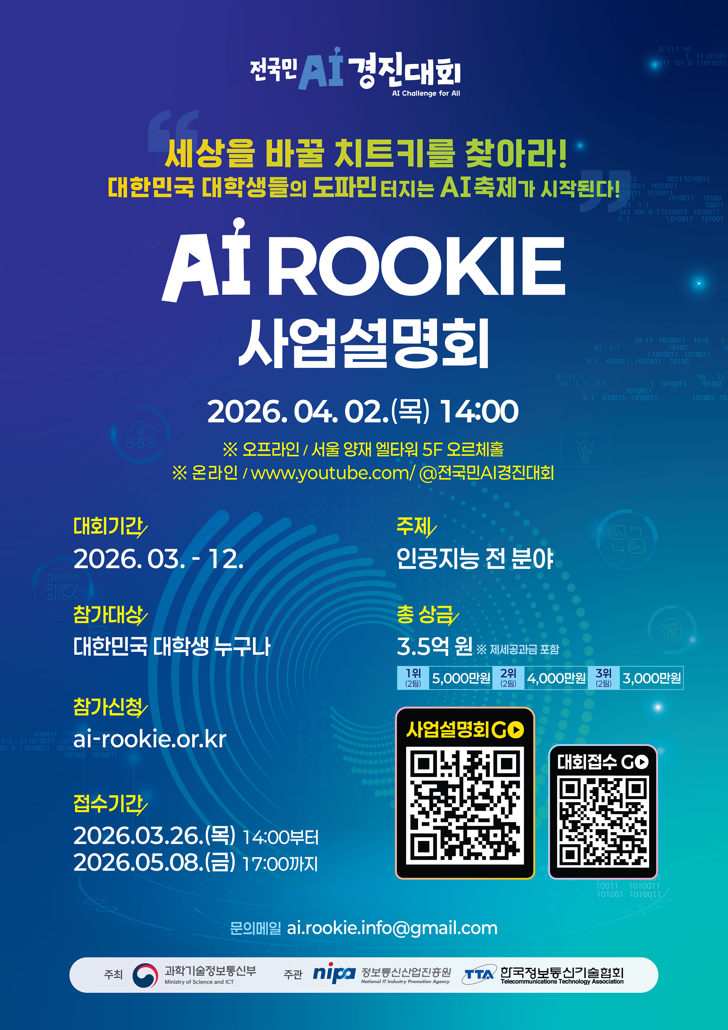총 상금 3.5억 원의 주인공이 될 청년 루키들을 위한 '2026년도 인공지능 루키 대회' 사업설명회에 여러분을 초대합니다.